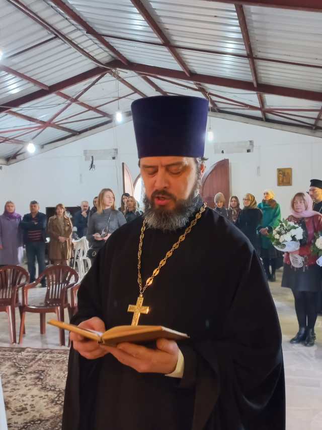 Он упомянул о том, что община собралась в этот день, чтобы помолиться о продолжении работ и о том, чтобы этот храм был местом притяжения живущих в стране верующих Русской Православной Церкви, куда они могли бы прийти каждый день и где можно было бы построить литургическую жизнь на основании русских православных традиций. В заключение архимандрит Филипп преподнес митрополиту Антонию в дар панагию в виде ливанского кедра.