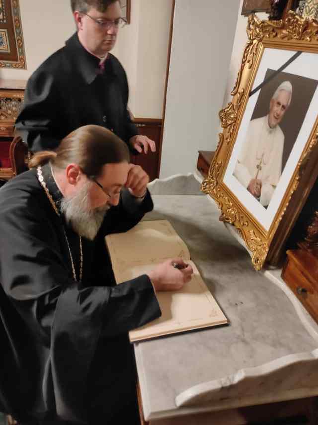Затем в зале приемов Мелкитской патриархии архимандрит Филипп оставил запись по случаю кончины почетного Папы Римского Бенедикта XVI в книге соболезнований.