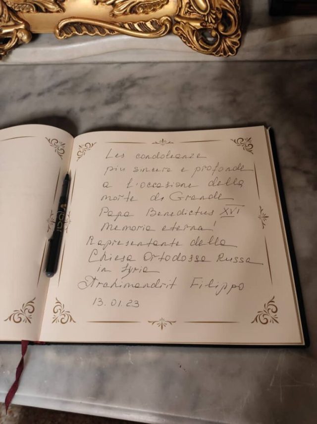 Затем в зале приемов Мелкитской патриархии архимандрит Филипп оставил запись по случаю кончины почетного Папы Римского Бенедикта XVI в книге соболезнований.